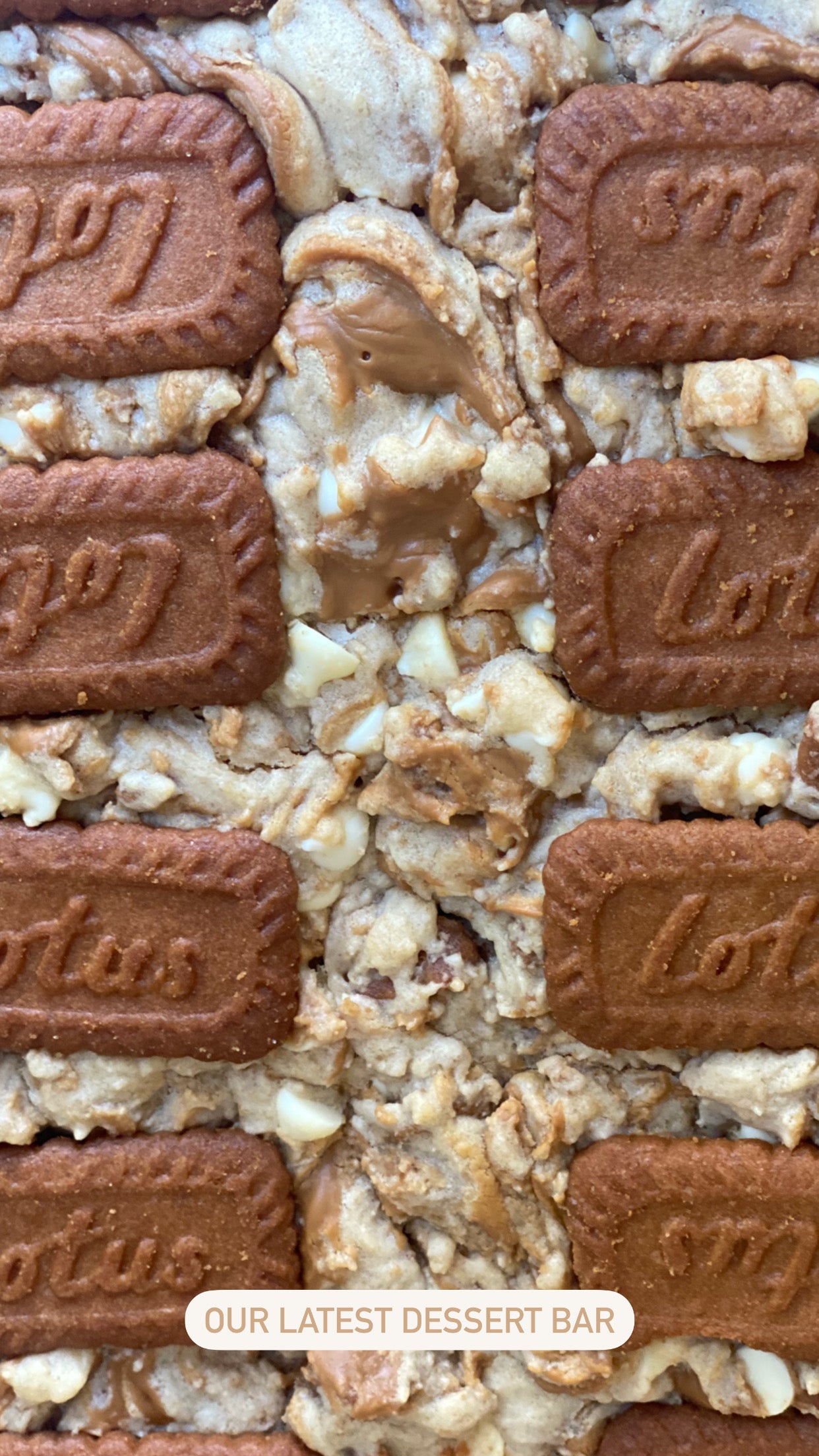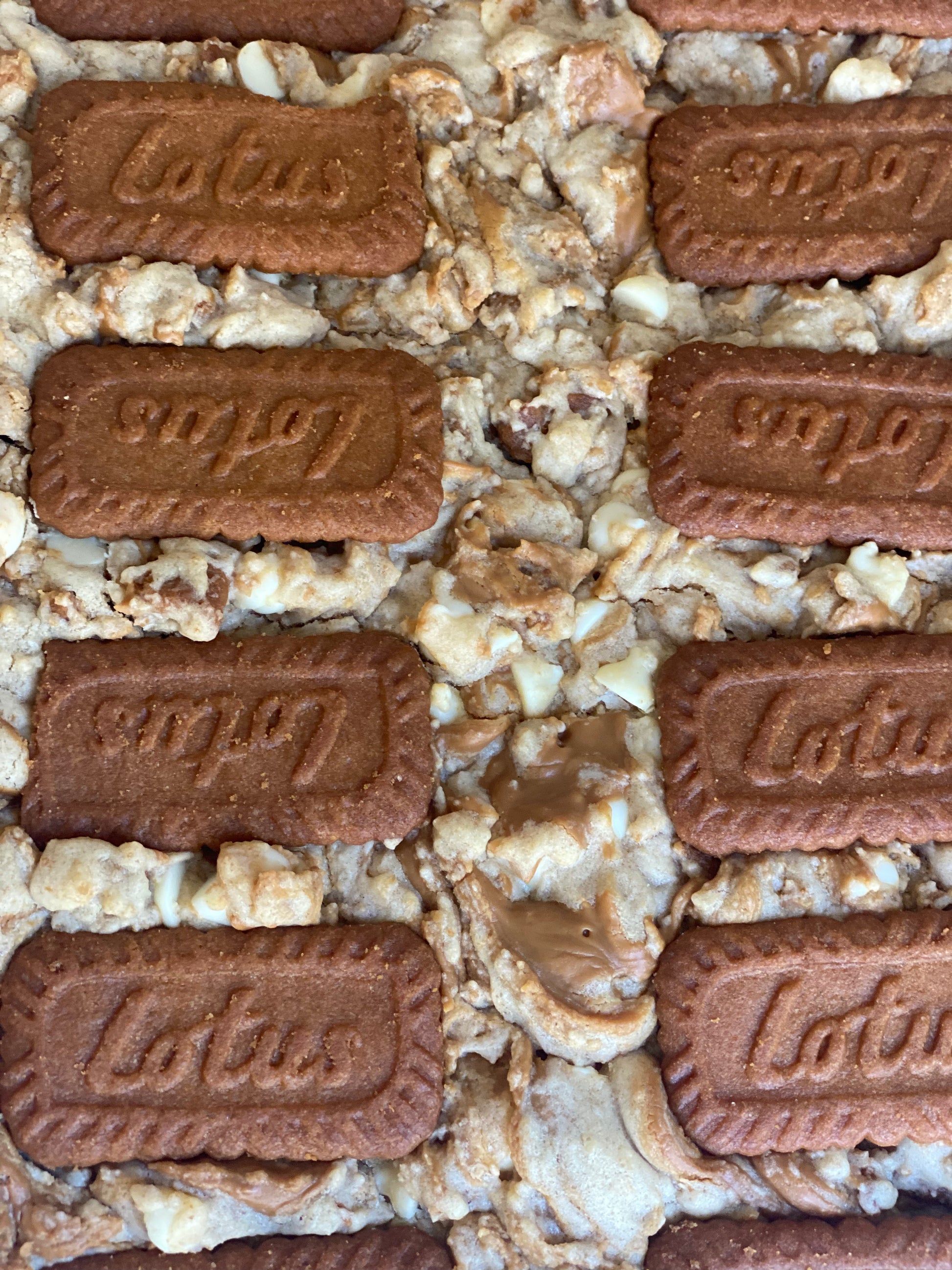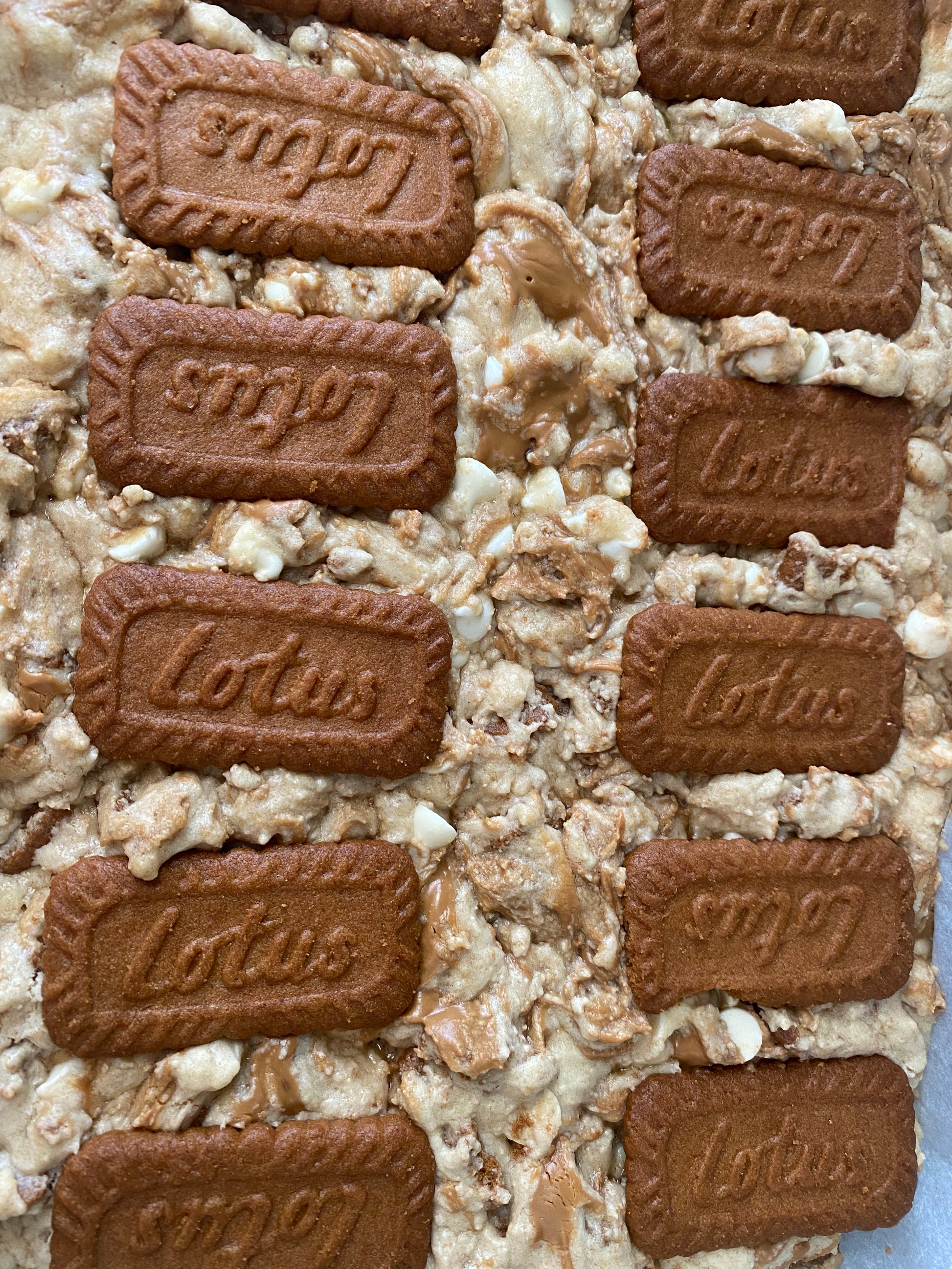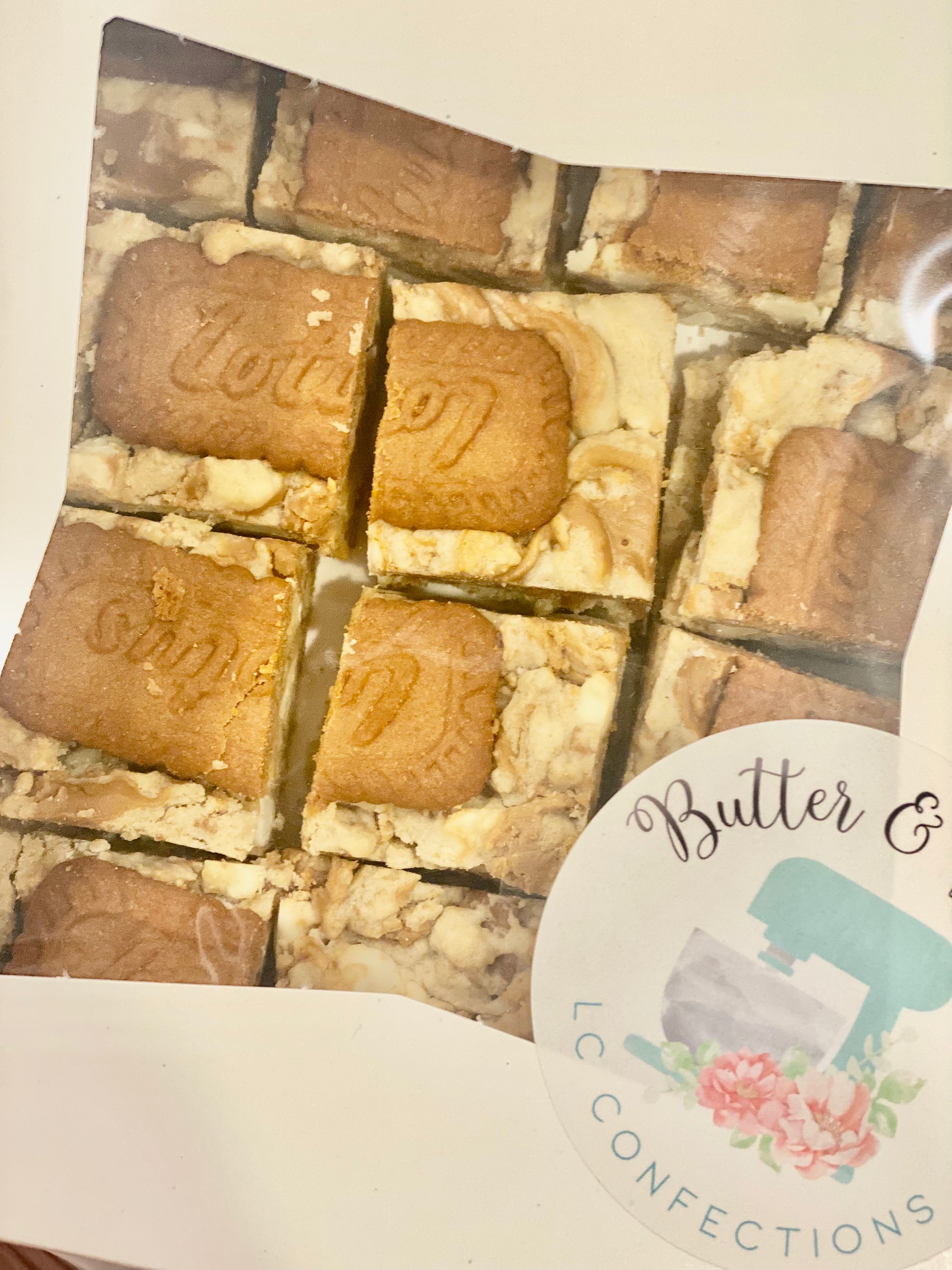 A delicious, melt-in-your-mouth Biscoff Cookie Butter blondie dessert bar. Loaded with white chocolate chips, Cookie Butter, and chunks of Biscoff cookies and topped with a Biscoff cookie.